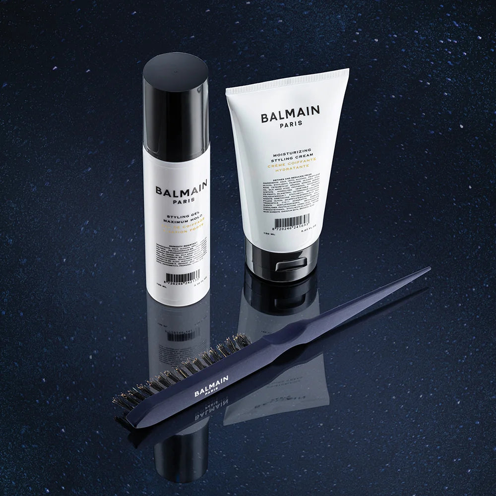 Create a flawless slick-back look with the Limited Edition Muse de la Fête styling set, featuring Moisturising Styling Cream, Maximum Hold Gel, and a Boar Hair Backcomb Brush. The cream and gel combine for long-lasting control and hydration, while the boar hair brush smooths hair for sharp, defined lines and a polished finish.