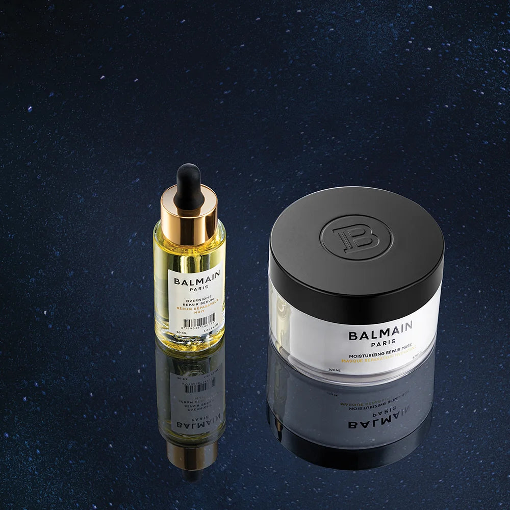 The Limited Edition Overnight Repair Care Set revitalises hair overnight with the Repair Serum and Moisturising Repair Mask. Blend a few drops of serum into the mask, leave it on as you sleep, and wake up to silky, radiant locks.