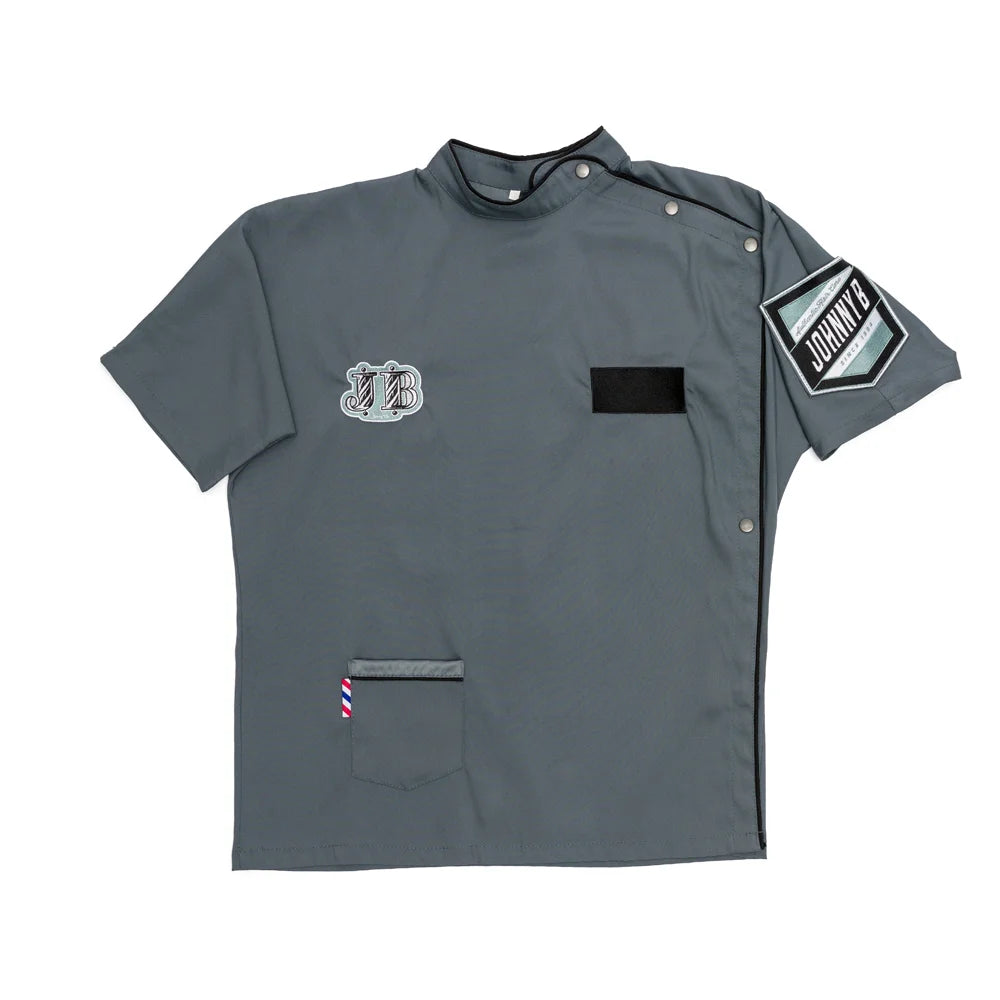 Our Retro Barber Smock features eclectic patches inspired by vintage designs, a comb pocket, and a place to embroider your name for that professional finish. Short sleeves allow for ease of movement, and closable neckline buttons provide a tapered look.