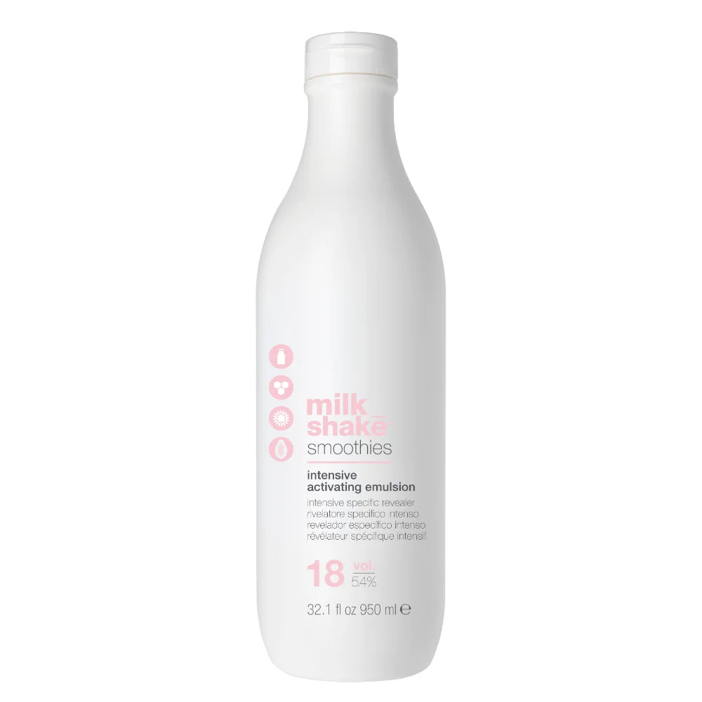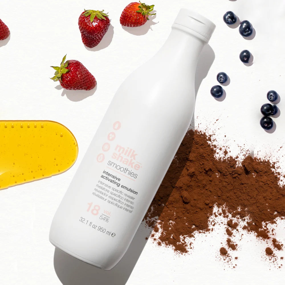 milk_shake smoothies intensive activating emulsion is formulated to work with milk_shake conditioning semi-permanent hair color for maximum pigmentation. Creamy, conditioning and pleasantly scented, milk_shake smoothies intensive activating emulsion has a gentle action on hair and scalp. Contains the exclusive Integrity 41®, which guarantees a great color seal. With a working volume of 18%.