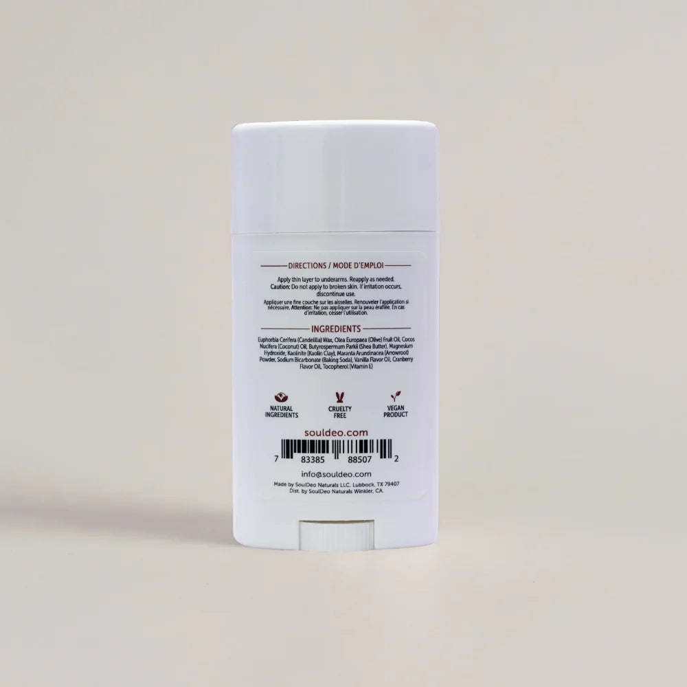 Euphorbia Cerifera (Candelilla) Wax, Olea Europaea (Olive) Fruit Oil, Cocos Nucifera (Coconut) Oil, Butyrospermum Parkii (Shea Butter), Magnesium Hydroxide, Kaolinite (Kaolin Clay), Maranta Arundinacea (Arrowroot) Powder, Sodium Bicarbonate (Baking Soda), Vanilla Flavor Oil, Cranberry Flavor Oil, Tocopherol (Vitamin E)