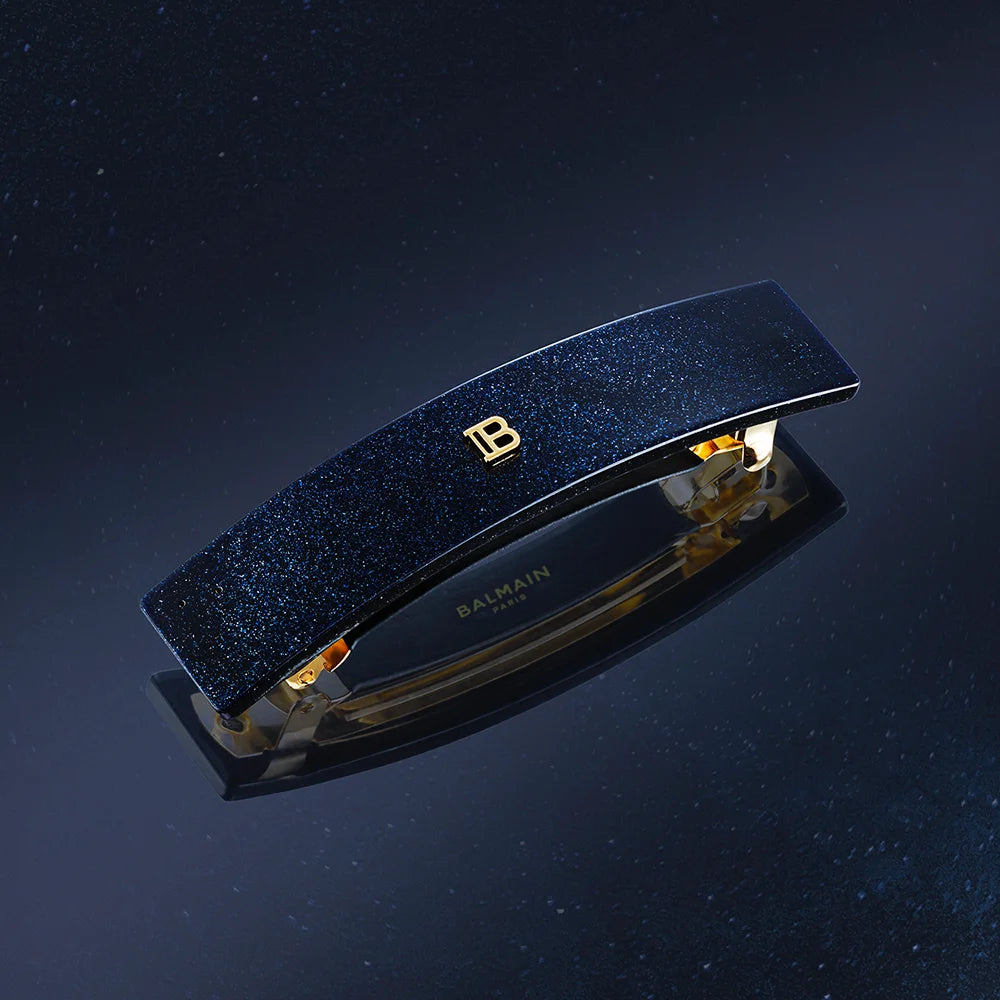 Inspired by the subtle shimmer of the night sky, this barrette pairs modern design with understated elegance. Made of durable hypoallergenic cellulose acetate in an elegant sapphire blue, the barrette offers lasting resilience with a gentle sparkle. It features a sleek gold-tone clasp to hold your hair securely in place and is adorned with the iconic 18K gold-plated Balmain 'B' logo. Its versatile sapphire hue complements any ensemble, whether casual or formal.
