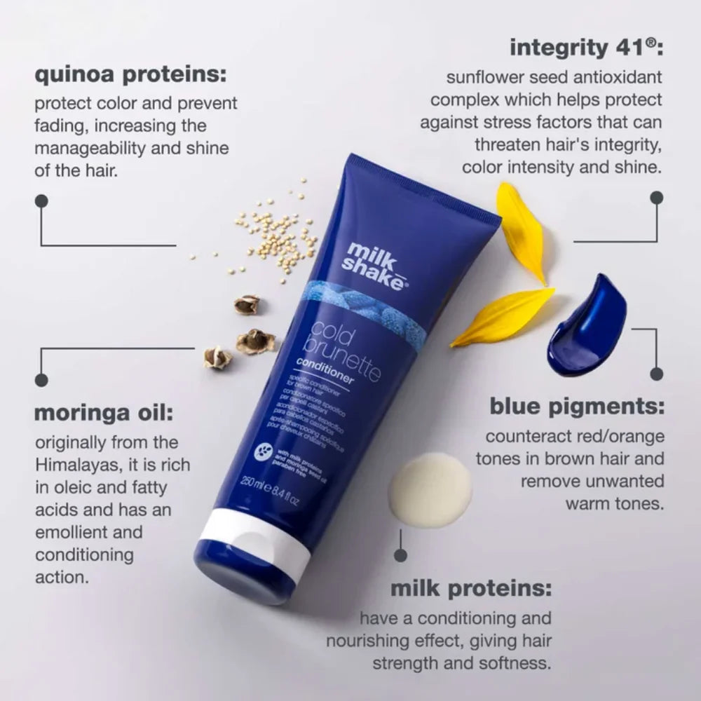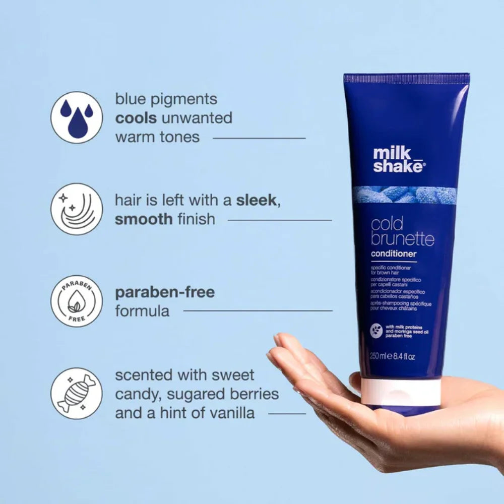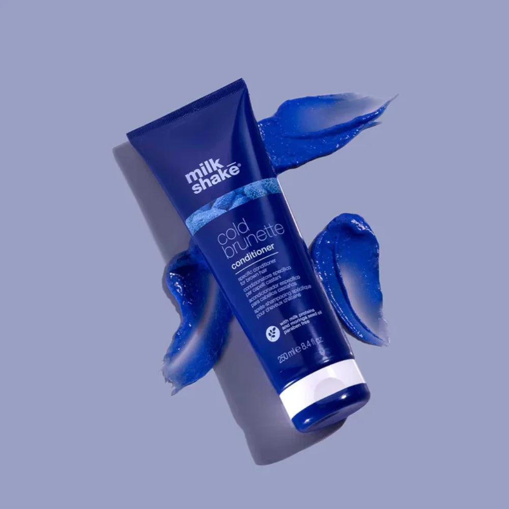 milk_shake cold brunette conditioner is a specific conditioner for brown hair. The special blue pigment contained within the new milk_shake cold brunette range, counteracts red/orange tones in brown hair while removing unwanted warm tones and making cool toning treatments last longer. Paraben-free.