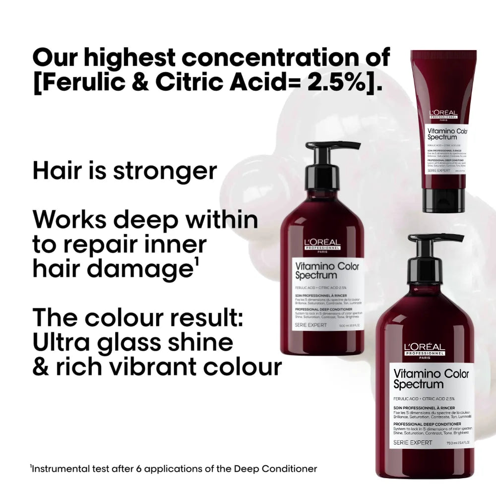 [Salon Exclusive] Vitamino Color Spectrum Professional Deep Conditioner by L’Oréal Professionnel, formulated with our highest concentration of actives [Ferulic Acid + Citric Acid] = 2.5%. Helps lock in your day 1 colour vibrancy for up to 100 days *. Works Deep within to repair inner hair damage**. The colour result: High glass shine & rich vibrant colours.