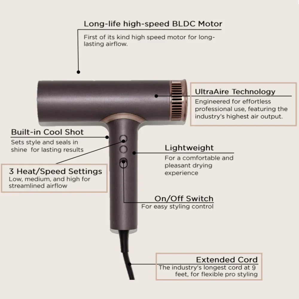 AirePower features a long-lasting 40mm UltraAire motor, which delivers high-speed drying with consistent, powerful airflow. Its lightweight design ensures all-day comfort, while advanced heating technology protects hair.