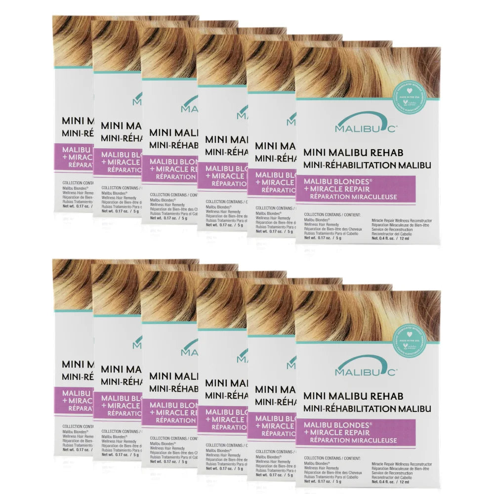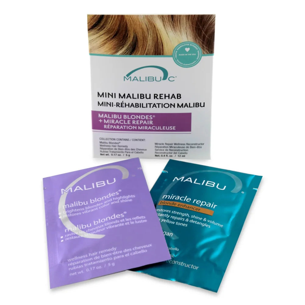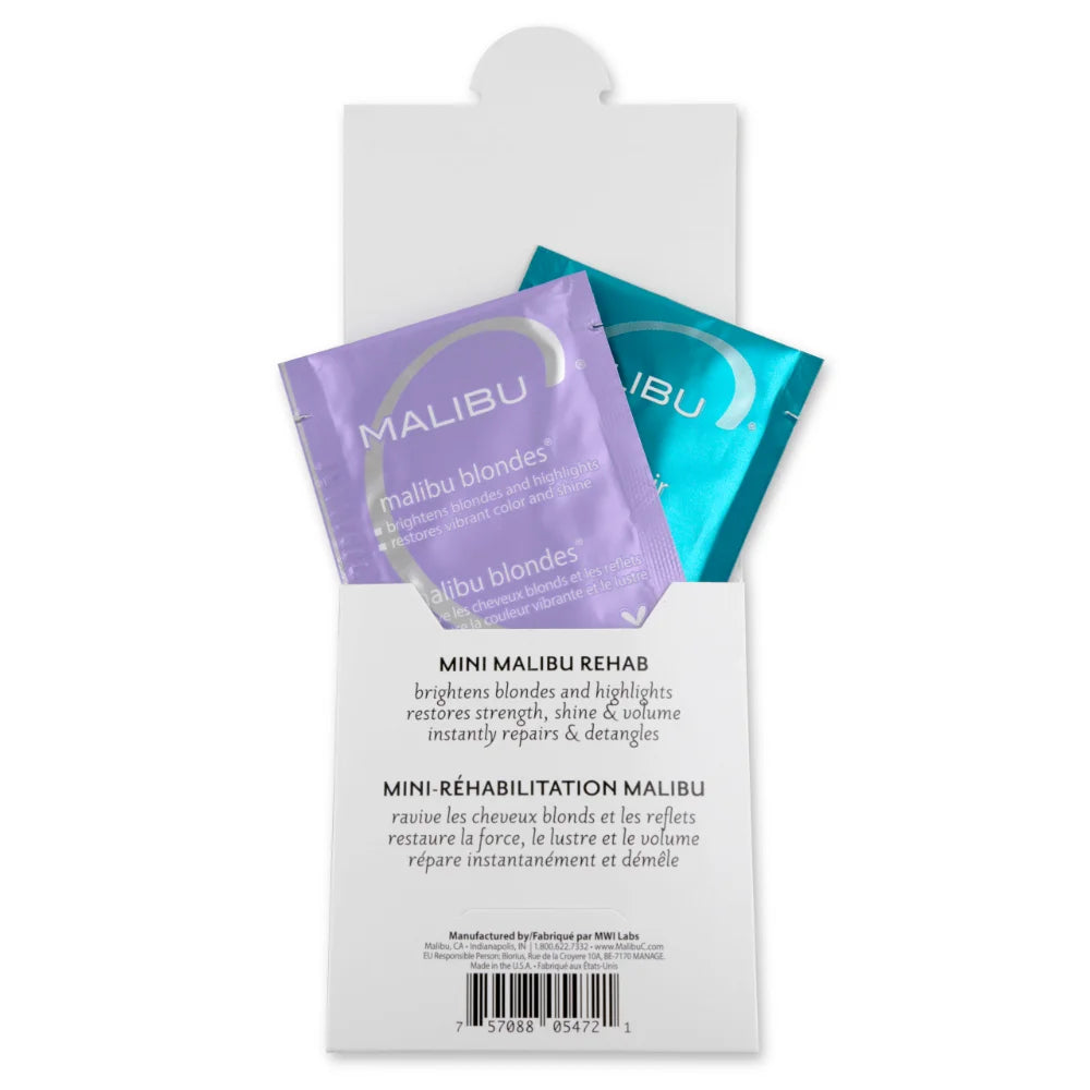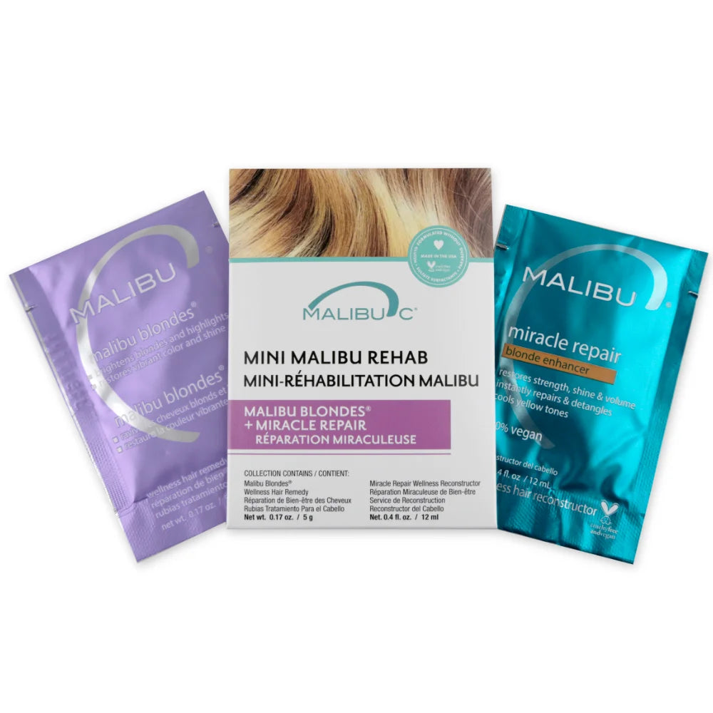 Keep blonde hair bright on the move with Mini Malibu Rehab Malibu Blondes, a travel-friendly vegan duo. It helps gently remove dulling minerals and buildup from hard water and products, while also helping to maintain softness, shine, and clarity for natural, highlighted, or platinum blondes between appointments.