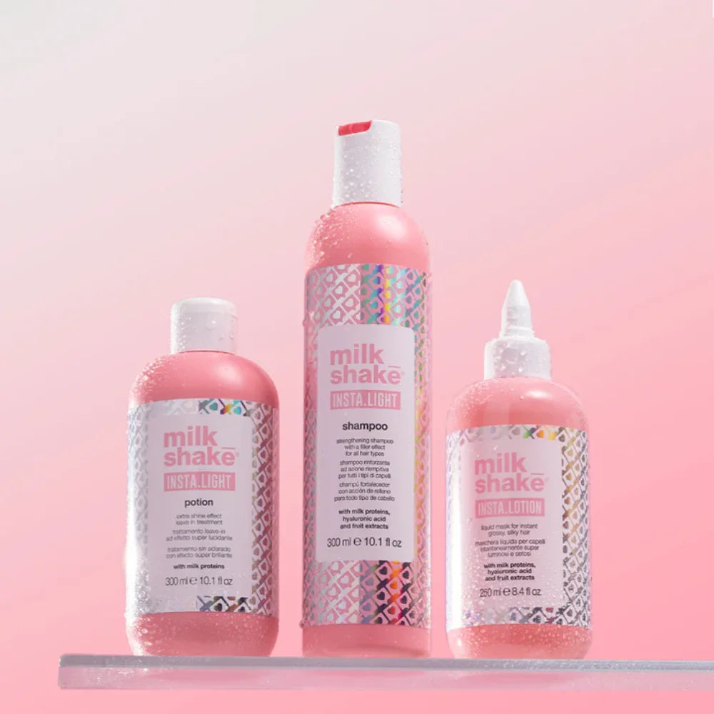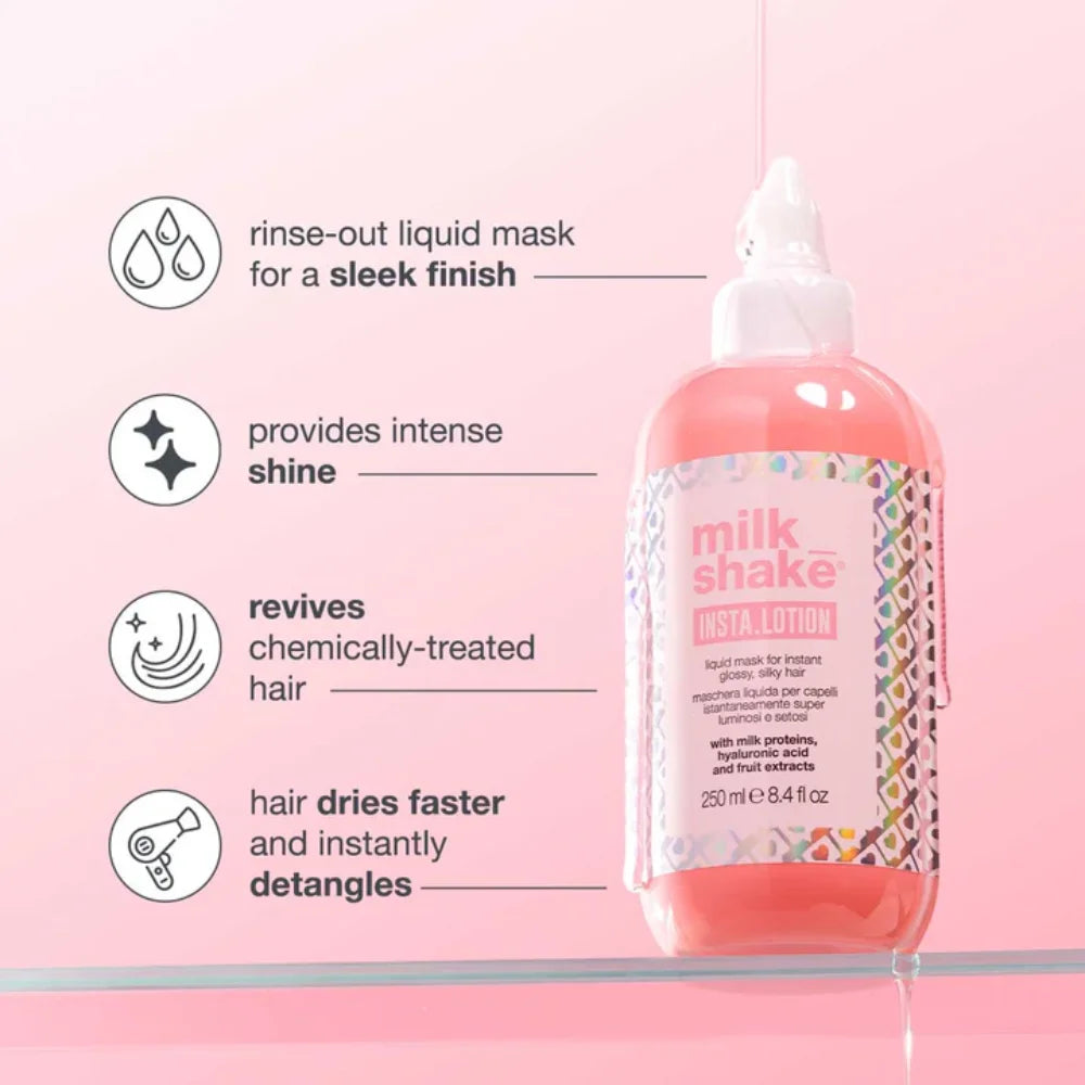 milk_shake insta lotion is a rinse-out liquid mask with hyaluronic acid that's as light as water. In just a few seconds gives manageability, shine, hydration and smoothness. It has a gorgeous fragrance. You'll never want to be without it. It is easy to apply, quick to rinse out, decreases drying time and has a reduced processing time.