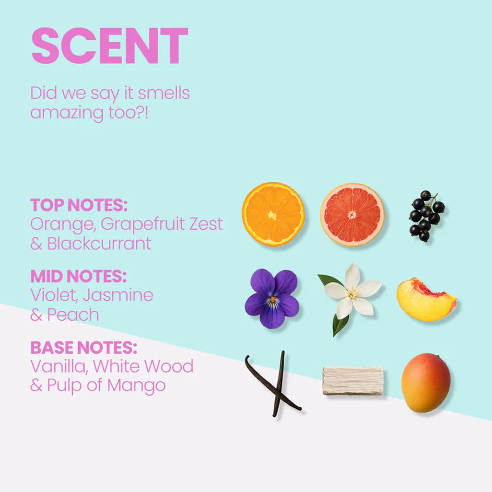 top notes of orange, grapefruit zest and blackcurrant, mid notes of violet, jasmine and peach, and base notes of vanilla, white wood, and pulp of mango. Heat styling just began to smell as good as it looks