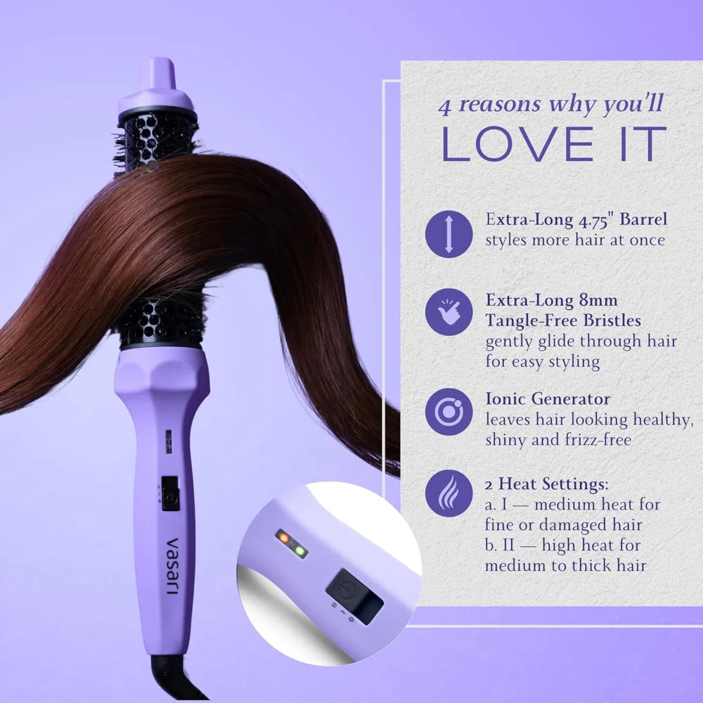 With this new electric curling iron brush, Vasari has also achieved Perfect Heat so you can be sure that it will not damage your hair. With medium and high-temperature settings, it is easy to find the perfect temperature for your hair to achieve amazing results in any hair thickness or texture. Unlike a flat iron or curling iron, this brush will never fry your hair. Plus, its ION generator and tourmaline ceramic coating will leave your hair looking healthy, shiny and frizz-free.