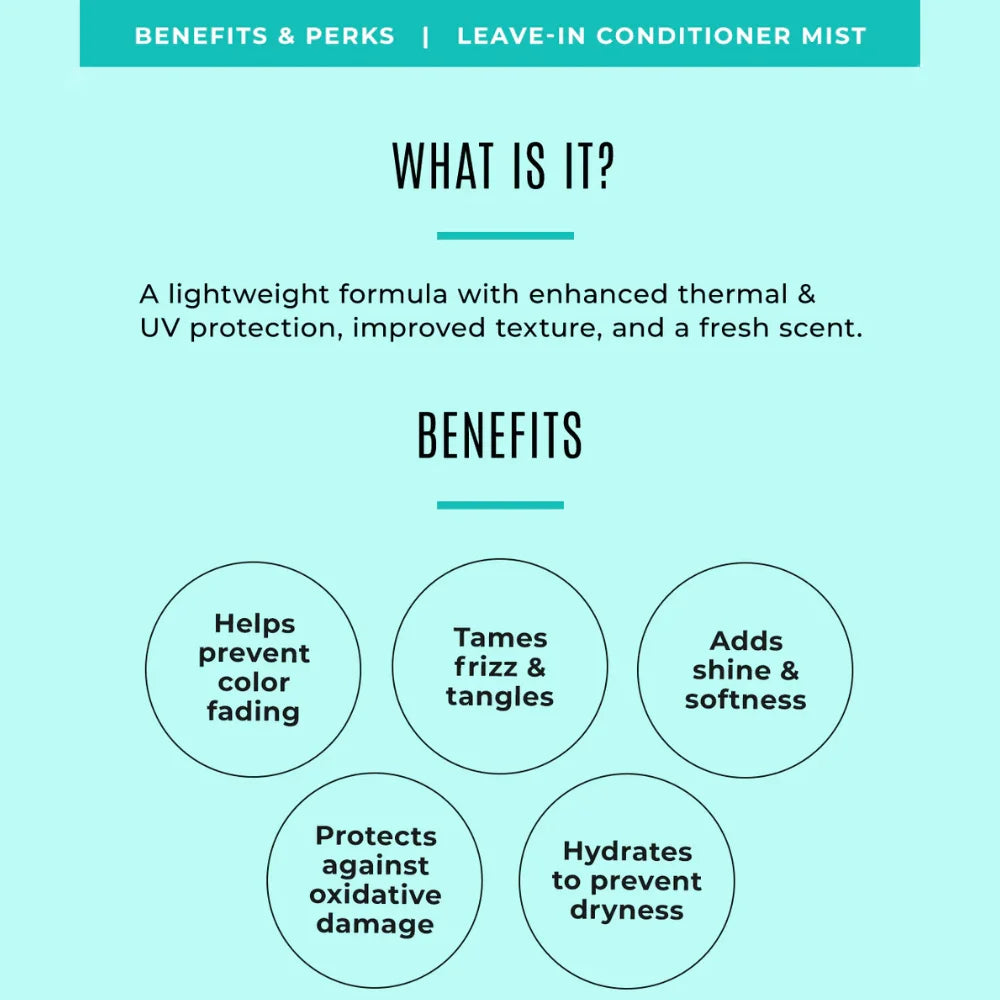 Refresh, hydrate, and manage oxidative damage with Leave-In Conditioner Mist, a vegan, lightweight spray that delivers advanced heat and UV protection while taming frizz and preventing breakage and color fading. Infused with panthenol and antioxidant-rich vitamins, it helps preserve vibrant color, restore moisture balance, and enhance softness and shine for smooth, manageable hair that feels as healthy as it looks.