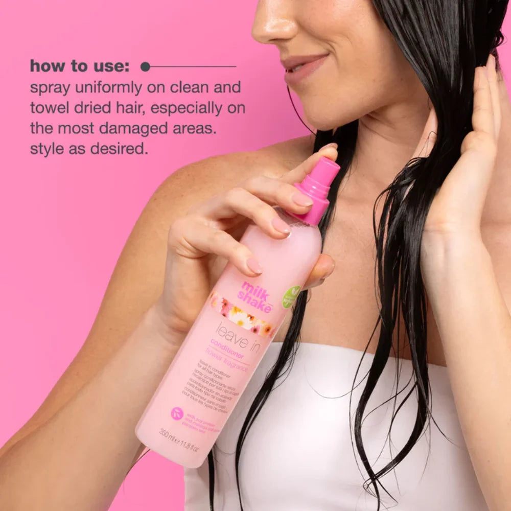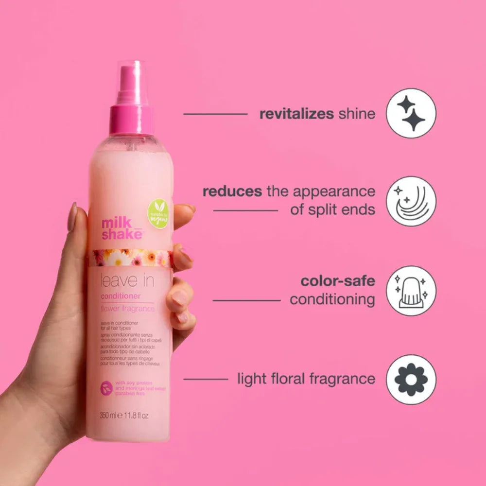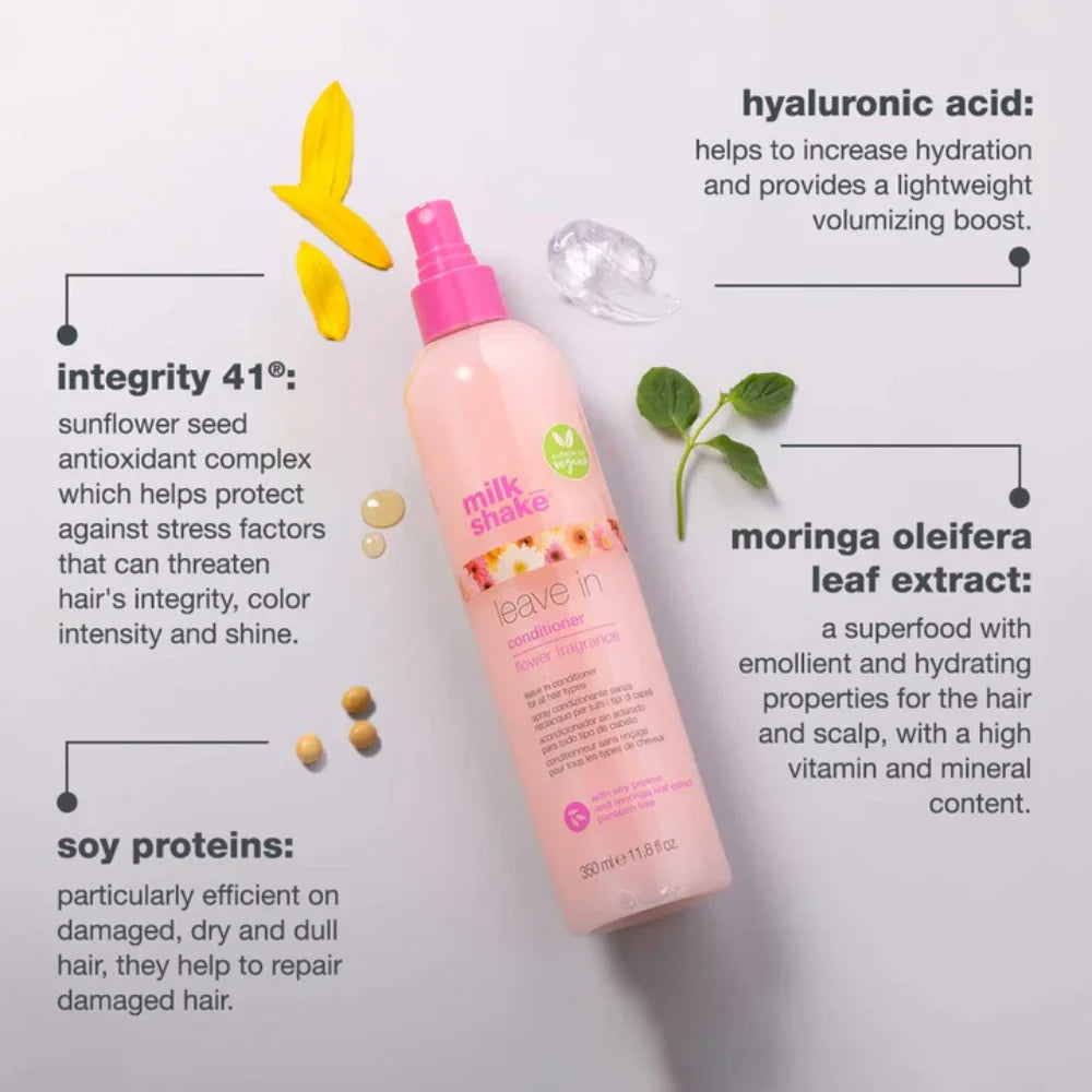 milk_shake leave in conditioner flower is a leave in conditioner spray that detangles, moisturizes and leaves your hair smelling divine with a sweet flower fragrance. Specifically formulated to condition normal to slightly dry hair and to make damaged hair easier to comb after using other conditioners or treatments. It generates optimum hair moisture balance and outer hair protection. Our unique best-seller combines its legendary professional performance with a fresh and seductive floral fragrance for the very first time. Soft, silky, shiny hair with a delicious floral fragrance, with special active ingredients: Hyaluronic acid with a film-forming action, gives long-lasting hydration and softness. Soy proteins strengthen and protect the hair fibre. Integrity 41® guarantees long-lasting hair color. Moringa extract nourishes the hair and is rich in revitalizing elements for scalp and hair. With no animal-derived ingredients, suitable for vegans.