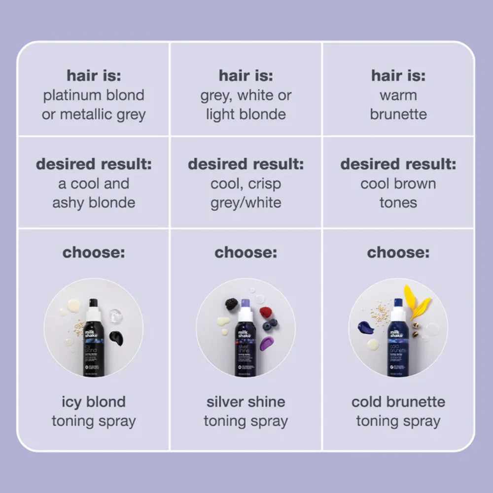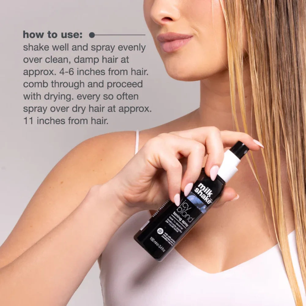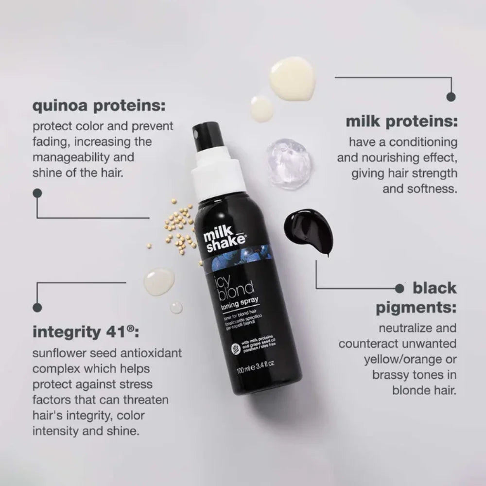 milk_shake icy blond toning spray is a specific toning spray for blond hair. It is a no-rinse spray formulated with a specific black pigment that counteracts brass while depositing ash tones in blond or lightened hair. Gives hair a healthy appearance while detangling and improving manageability.