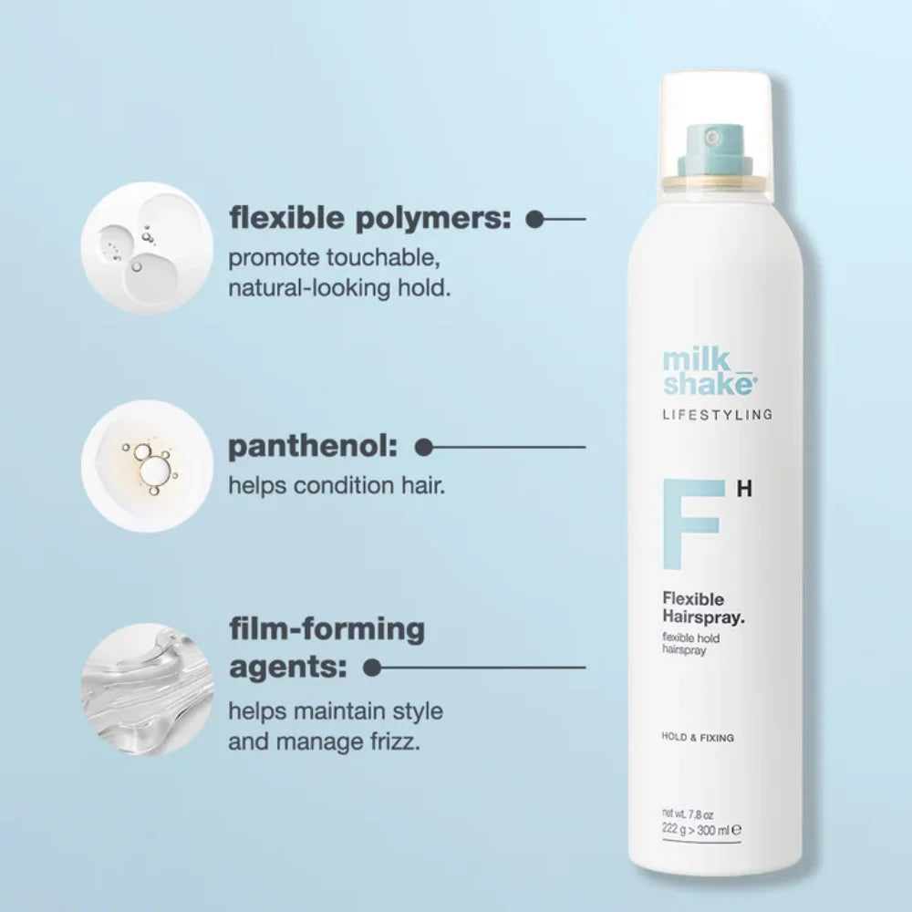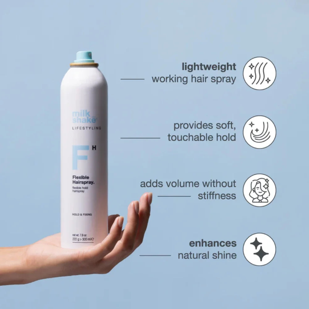 milk_shake lifestyling flexible hairspray is a lightweight finishing spray that delivers flexible, light-to-medium hold while supporting natural movement and enhancing body and shine. The airy formula helps maintain style without stiffness, leaving hair soft, touchable, and full of life.
