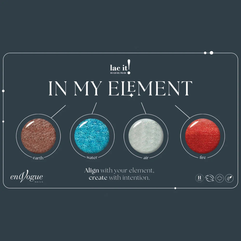 Written in the stars, reflected on your nails. In perfect alignment with the season, en Vogue Nails introduces the lac it! fall/winter collection, "In My Element" - a collection of four new elemental shades designed to channel the energy of Earth, Air, Fire, and Water.