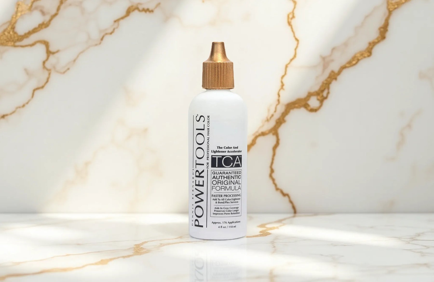 TCA, The Color and Lightener Accelerator, processes with low heat in just 4-10 minutes! Work with permanent color, semi-permanent color, demi color, bleach, foil & high lift applications in half the time when added to any manufacturer’s color or lightening product.