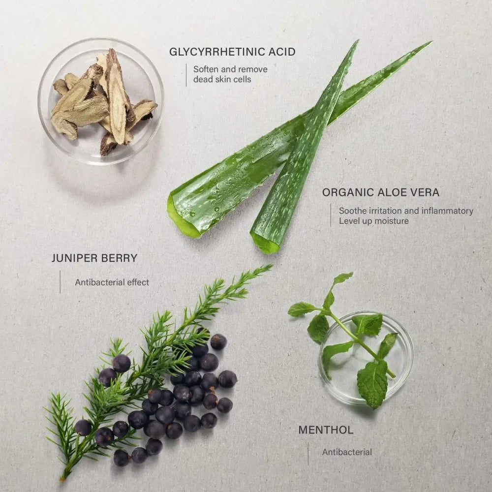 Alcohol Denat. (S.D Alcohol 40-A), Water (Aqua), Butylene Glycol, Alcohol, Polysorbate 20, Glycerin, Niacinamide, Panthenol, Menthol, Polysorbate 60, Glycyrrhetinic Acid, Propylene Glycol, Cedrus Atlantica (Atlas Cedar) Oil, Hexamidine Diisethionate, Litsea Cubeba (May Chang) Fruit Oil, Mentha Arvensis (HAKKA YU) Leaf Oil, Pogostemon Cablin Leaf Oil, Sodium Chloride, Butyl Avocadate, Citral, Sodium Usnate, Sodium Cyclic Lysophosphatidic Acid, Citrus Grandis (Grapefruit) Seed Extract, Piroctone Olamine, Limonene, Triethanolamine, Disodium EDTA (Edetate Disodium), Linalool, Citronellol, Geraniol, Tocopherol.