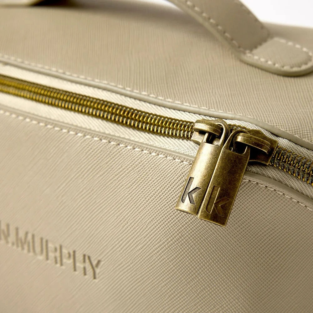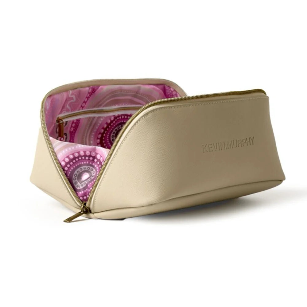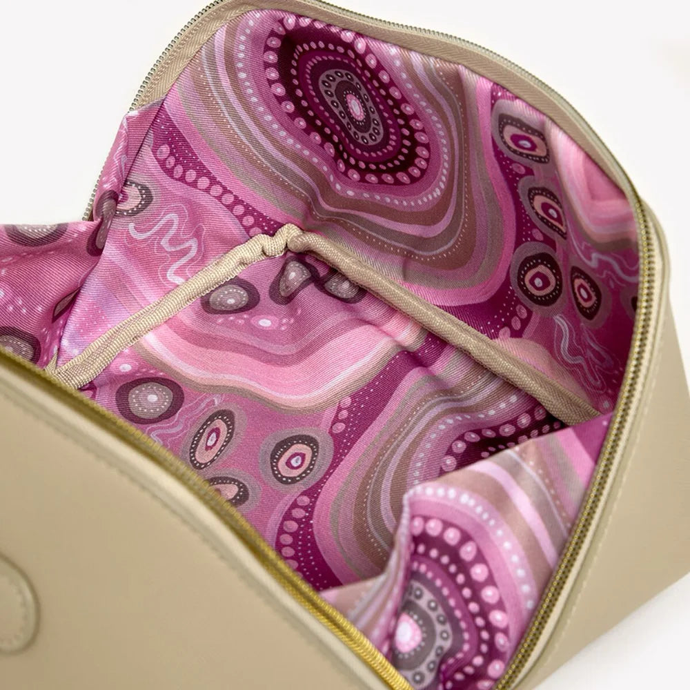Our limited edition cosmetic bag blends minimalist design with elegant details. A durable Saffiano leather-look exterior pairs with metallic zippers for a sophisticated touch, while the spacious interior features exclusive artwork by Aboriginal artist Holly Sanders. Stylish and functional, it’s perfect for travel or daily use.