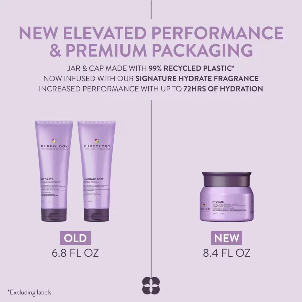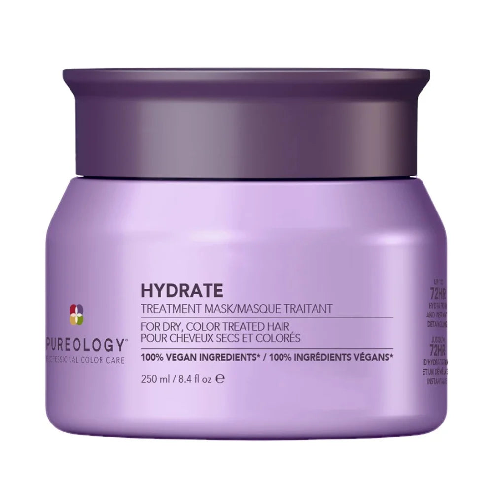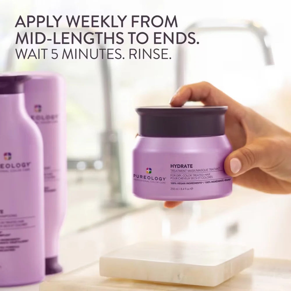 Bring life back to your hair with Pureology Hydrate Treatment Mask, the ultimate moisture-rich formula crafted for dry, color-treated hair. This luxurious, 100% vegan hair mask quenches thirsty strands while preserving vibrant color, leaving your hair sott, silky, and full of shine.