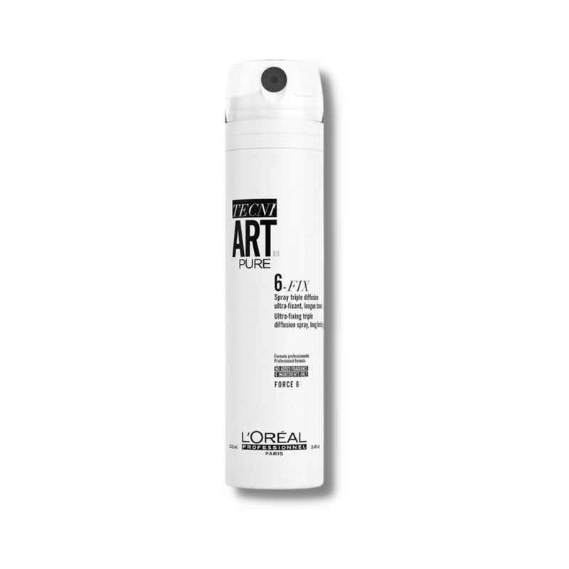 L’Oréal Professionnel Tecni.ART 6-FIX is our strongest fixing spray. Triple diffusion dry mist, 24-hour extreme hold* and humidity protection. extra-strong, long-lasting, quick drying hold without crunchiness.a must-have to keep it tight.